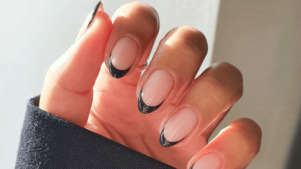 Si el negro es uno de tus colores favoritos, ¿por qué no llevarlo en tu manicura? En esta versión, puedes reemplazar el clásico blanco tiza por un esmalte oscuro para delinear las puntas de tus uñas. Para que resalte, te recomendamos darles forma almendrada y hacer una raya de grosor medio, ni muy gruesa ni muy fina.