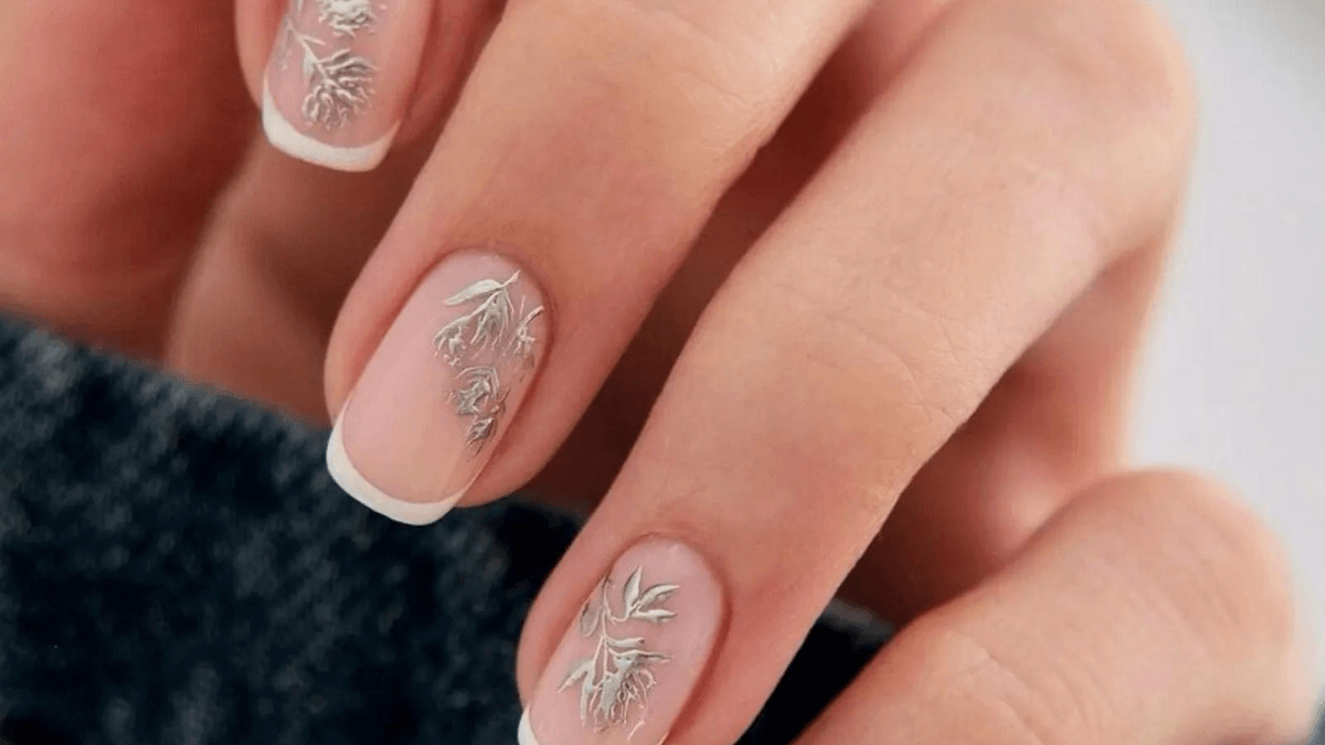 Si tienes las uñas cortas y deseas añadir un detalle encantador a tu manicura francesa, los motivos florales son tu mejor opción. Traza la delicada silueta de unas camelias en plata sobre un esmalte nude, ¡verás como añaden un toque de sofisticación a tus manos!