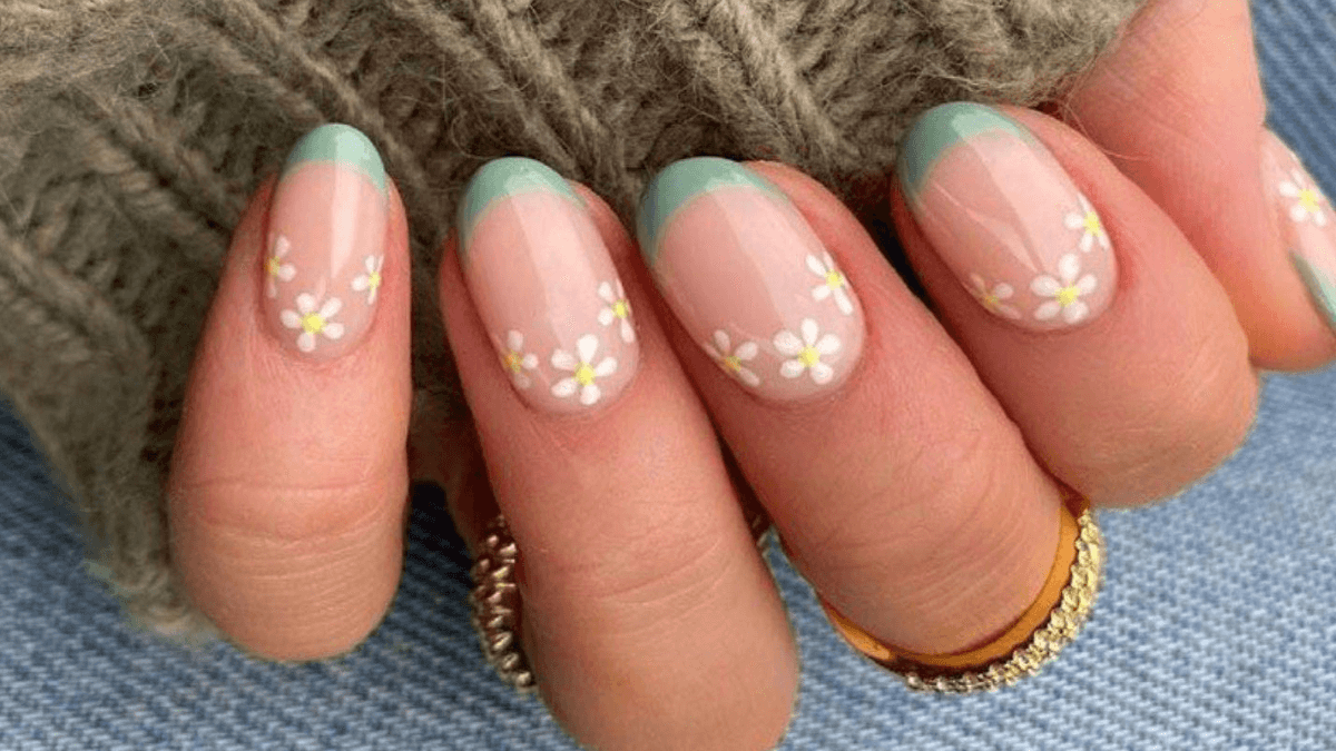 ¡Todo florece con el encanto de la primavera! Este diseño de manicura francesa para uñas cortas fusiona la frescura de las puntas turquesa con la delicadeza de las margaritas, creando un estilo romántico. ¿Te animas a darle vida a tus manos con él?