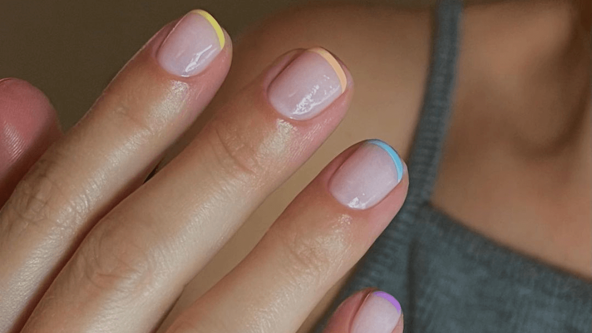 Celebra la llegada de la temporada primavera-verano inyectando color no solo en tus looks, sino también en tu manicura. ¿Por qué no considerar una alternativa que incluye una variedad de tonos pastel y evoca un arcoíris? Además, este diseño de uñas francesas cortas añadirá un toque divertido a tu estilo.