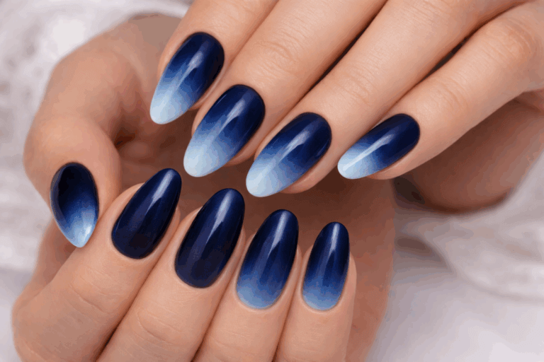 El azul noche degradado hacia azul hielo recuerda al cielo invernal. Es un diseño versátil que funciona tanto en uñas cortas como largas, y se puede potenciar con glitter plateado en las puntas. Ideal para quienes quieren un toque festivo sin perder elegancia.