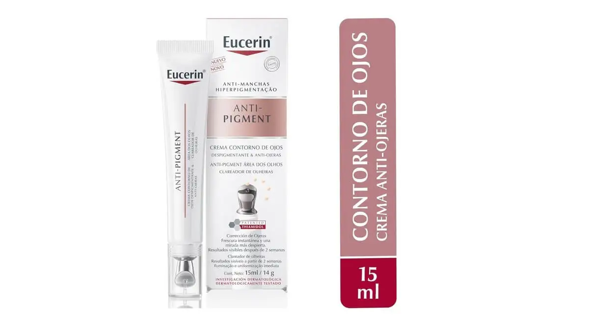 La línea Anti-Pigment de Eucerin reúne productos enfocados en reducir las manchas y su contorno de ojos vale contra ellas y las ojeras oscuras. El Thiamidol en su fórmula es el encargado de esto: un compuesto patentado por la marca cuya función es reducir la melanina en la zona. Tampoco podemos dejar de nombrarte su cómodo aplicador, que evita que te ensucies los dedos.
