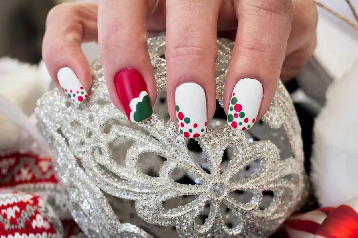 El estilo milky con colores navideños es todo un hallazgo del nail art. El fondo blanco con los elegantes dots y el diseño contrastante, donde el rojo es protagonista, hace que estas uñas las puedas usar todo el día y la noche de Navidad.