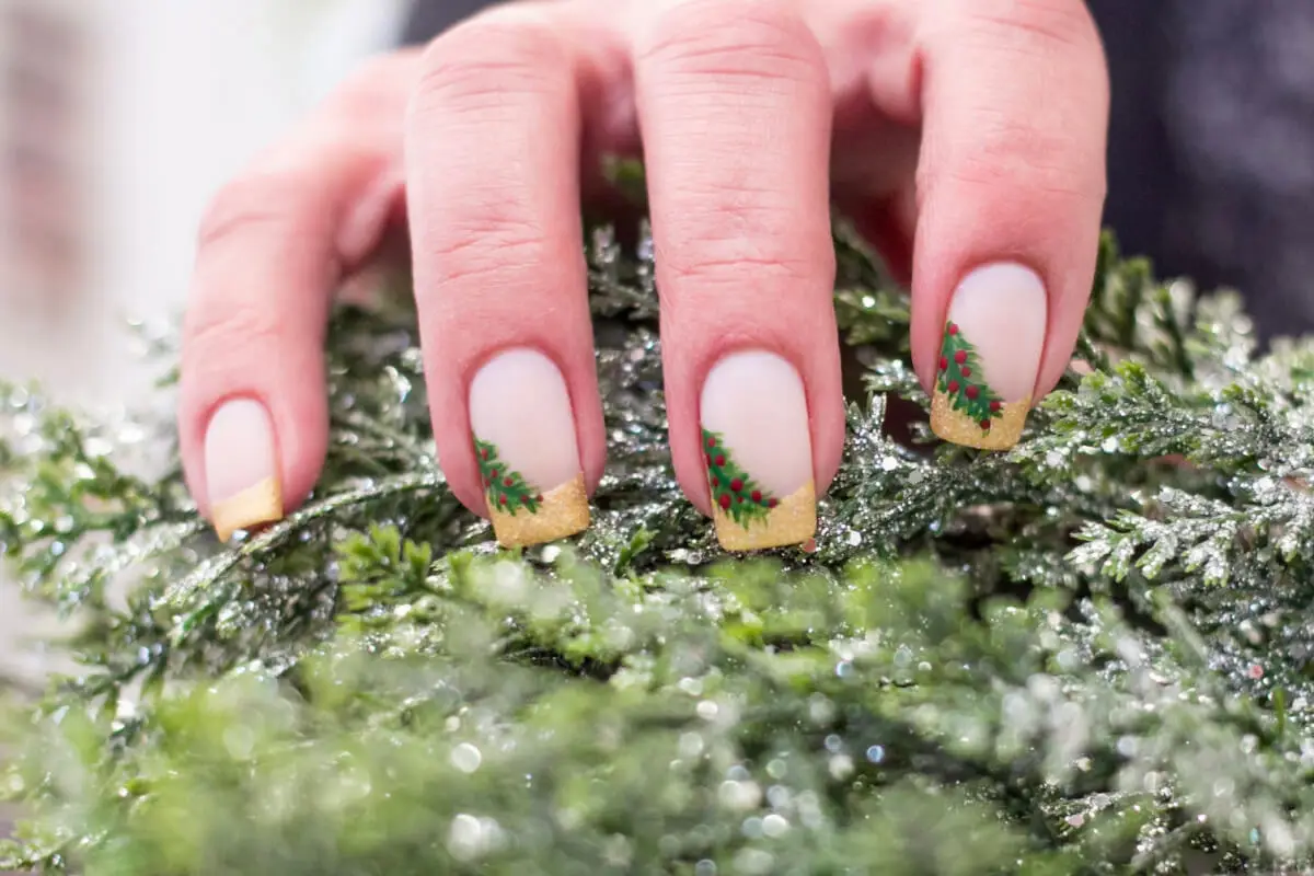 Las uñas francesas nude con puntas en los tonos de temporada, combinan la elegancia discreta con destellos festivos. La base clara aporta sutileza y sofisticación, mientras las puntas en colores como el dorado, añaden un toque de glamor navideño al que se suma el detalle verde de las ramas de pino.
