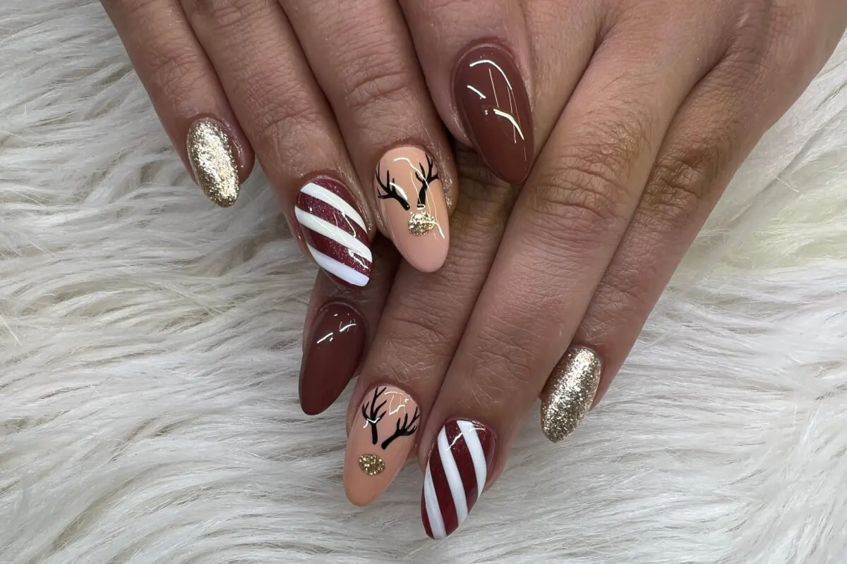 Prepárate para robarte todas las miradas con estas espectaculares uñas almendradas en tonos chocolate, nude y blanco, con detalles minuciosos de renos y el acento de brillo que agrega un toque de glamur a la manicura. La forma almendrada suaviza la apariencia general, creando una mezcla armoniosa de estilo invernal y sofisticación.