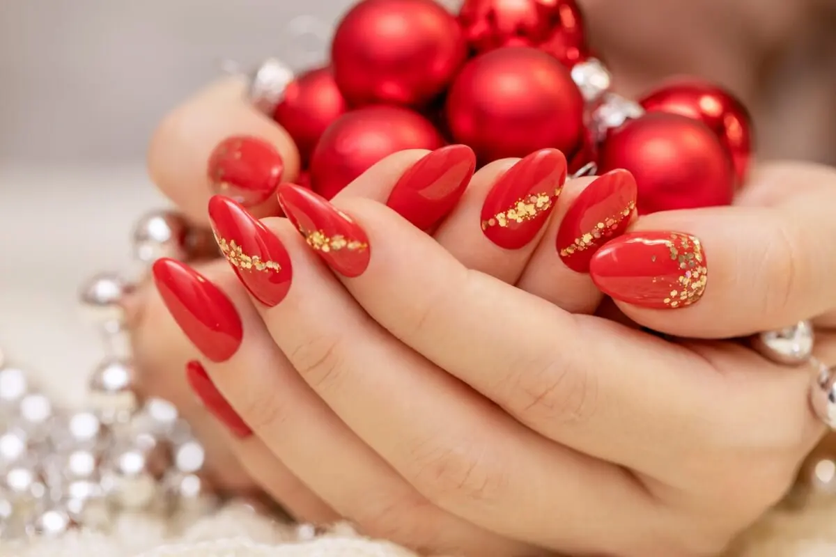 24. Uñas almendra rojas decoradas con purpurina dorada