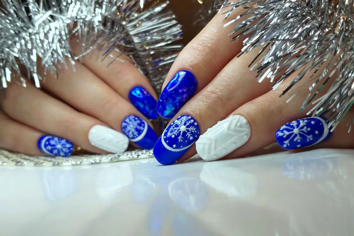 11. Uñas medianas azules con efecto velvet y cristales de nieve