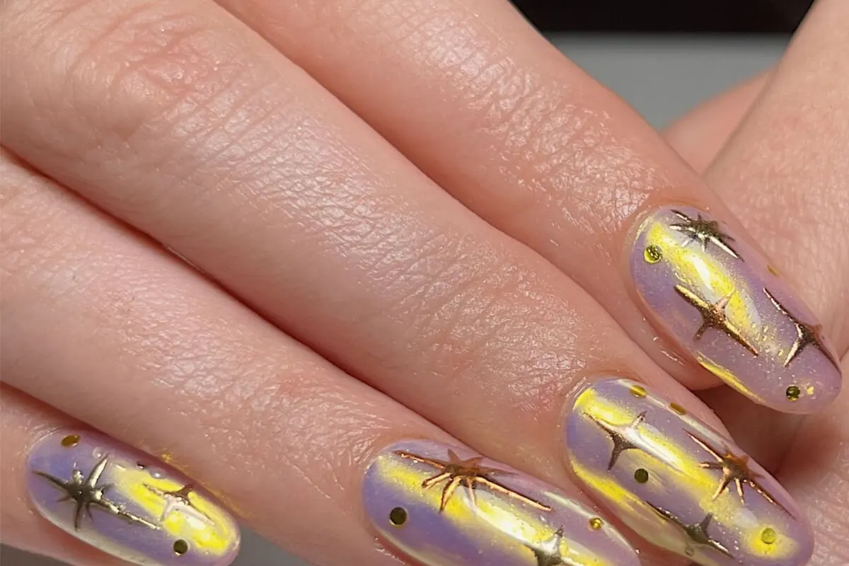 Con efecto degradé, estas uñas largas y triangulares van del violeta al tono lavanda creando un efecto único. Cada uña está adornada con estrellas y puntos dorados que añaden un brillo que se complementa con el color, sin invadirlo ni opacarlo.
