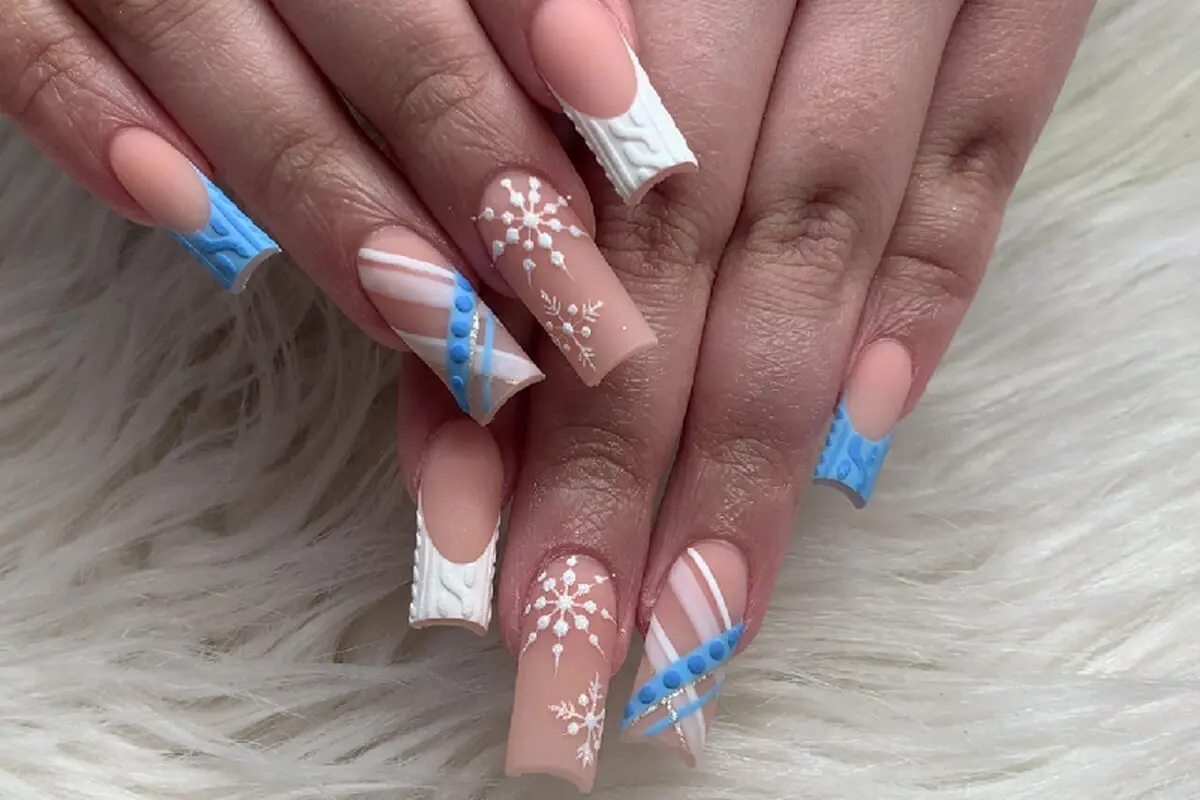 14. Uñas navideñas largas azul cielo con cristales de nieve