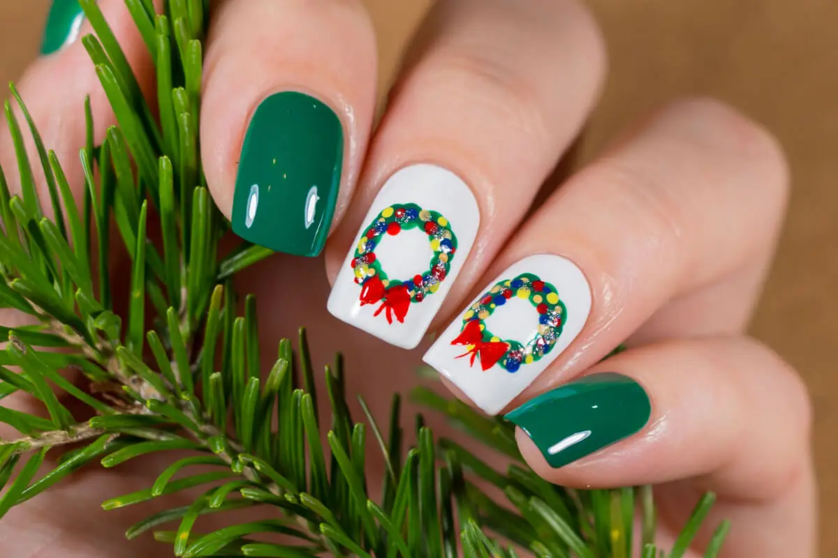 33. Uñas medianas verdes con coronas navideñas coloridas