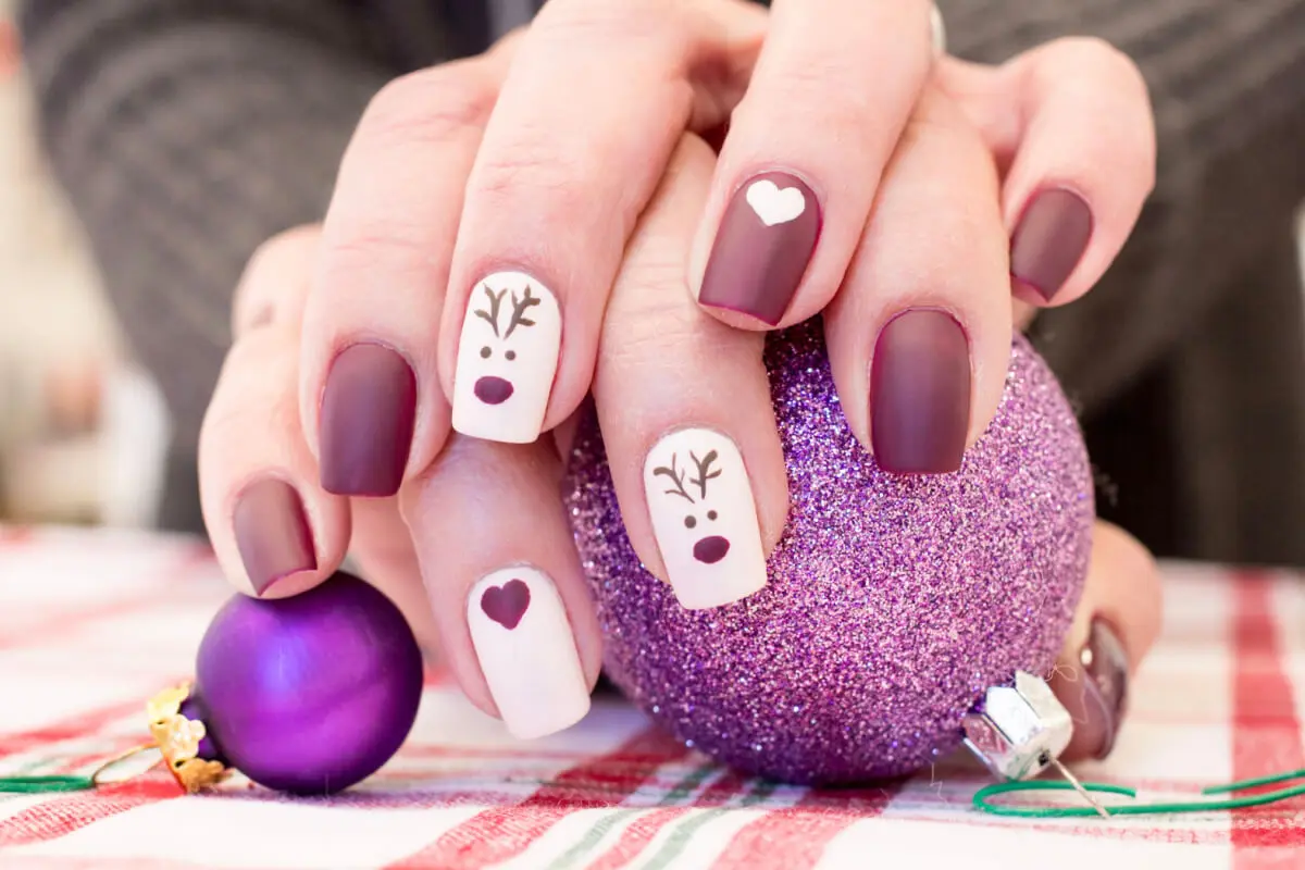 Este diseño de manicura para uñas cortas, medianas y largas, destaca por su combinación de tonos mate en violeta y blanco. Los detalles cuidadosamente ejecutados de renos en blanco y corazones, añaden un toque juguetón y festivo a este modelo que puedes lucir en esta Navidad.