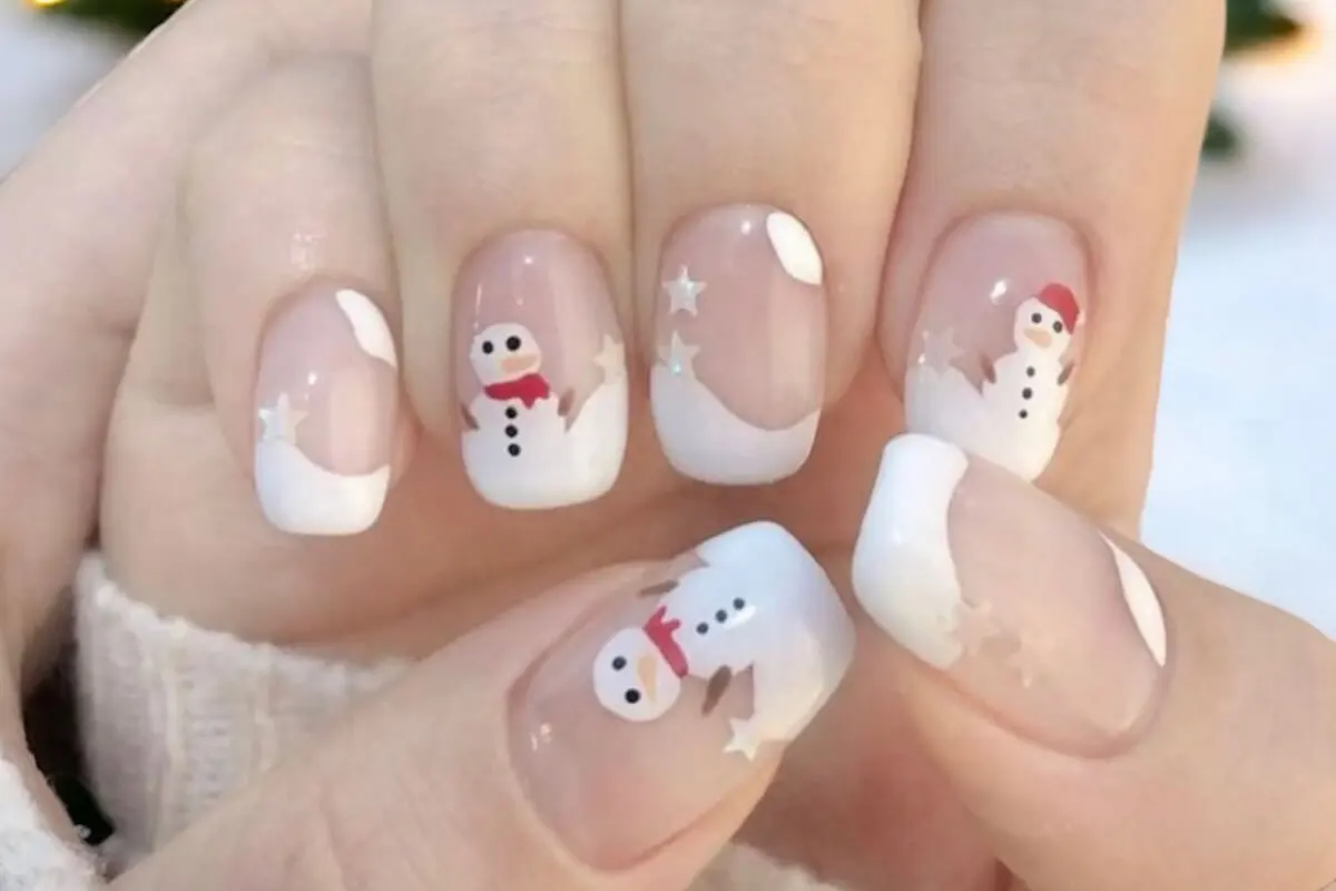 Si eres arriesgada y divertida a la vez, una excelente opción para uñas navideñas es la que ofrecen los muñecos de nieve combinados con la francesa. Esta manicura captura la alegría navideña con estilo, expresando la magia de la temporada.