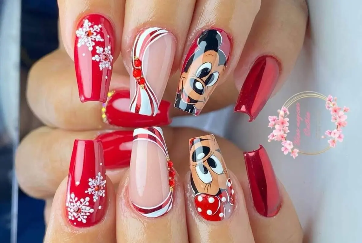 Esta manicura fusiona la alegría de las fiestas navideñas, con la fantasía encantadora de los personajes de Disney y los brillos aportan un efecto 3D en las uñas. Con detalles y colores intensos, este estilo captura la esencia mágica de la temporada.
