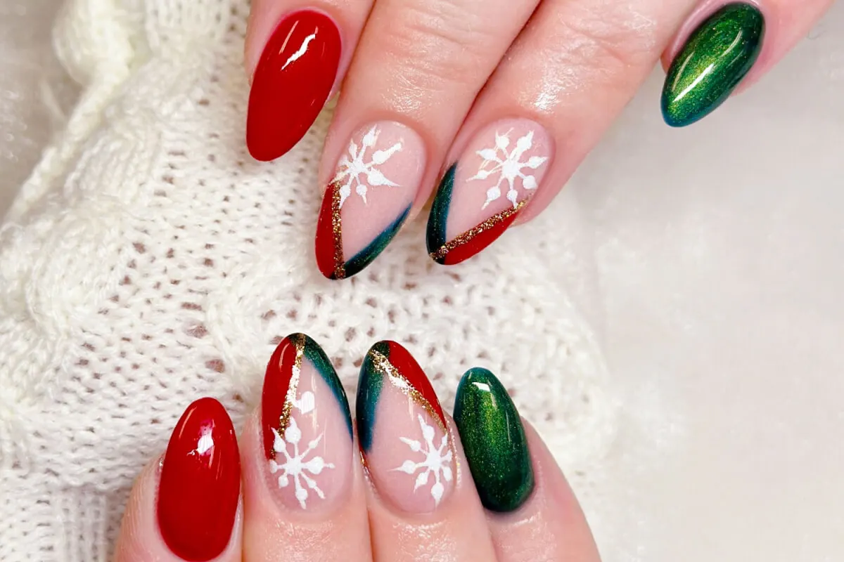 Alterna o combina el rojo y el verde como prefieras, suma brillos junto a delicados cristales de nieve blancos en relieve. La forma almendra suaviza la apariencia, mientras que los detalles brillantes añaden un toque de elegancia. El diseño de en medio corresponde a la manicura francesa en V, es muy fácil de lograr y puedes combinar colores navideños. Esta es una opción perfecta para quienes buscan un equilibrio entre modernidad y sofisticación.