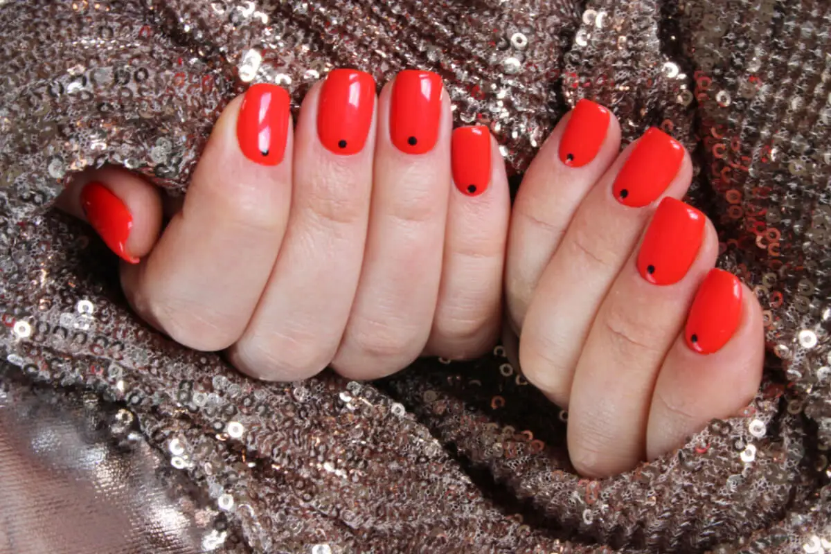 Esta manicura, de color rojo vibrante y diseño de uñas minimalista, está decorada con pequeños puntos negros o dots. Esta combinación de colores y diseño proporciona un contraste sutilmente llamativo, con una apariencia moderna y divertida.