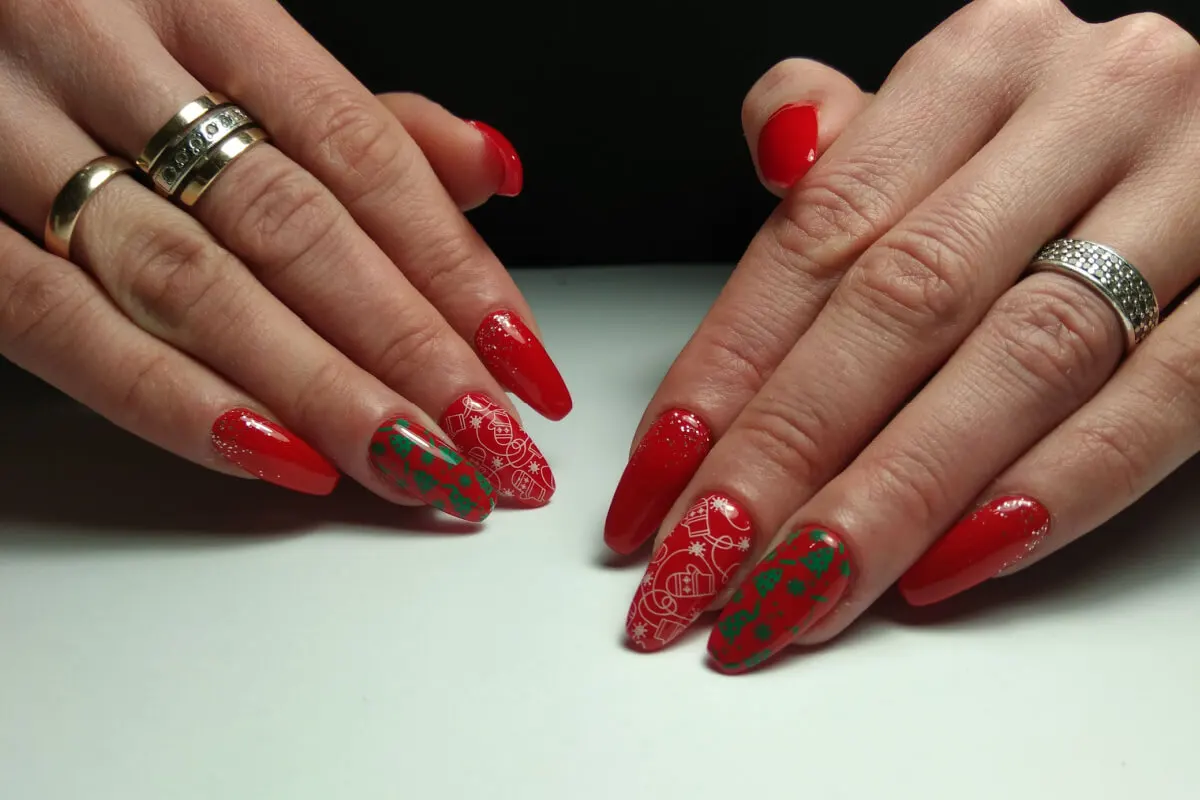 7. Uñas rojas con pinitos verdes y dibujos navideños
