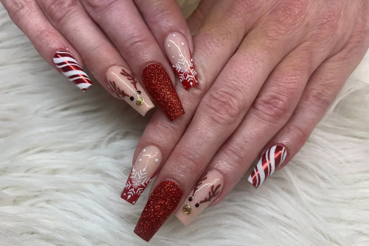 Estas impresionantes uñas acrílicas, en tamaño XXL, ofrecen una suma de estilos única. El diseño combina varios motivos: renos en contraste, cristales de nieve, el estilo swir nails y brillo texturado, creando una amalgama visualmente impactante.