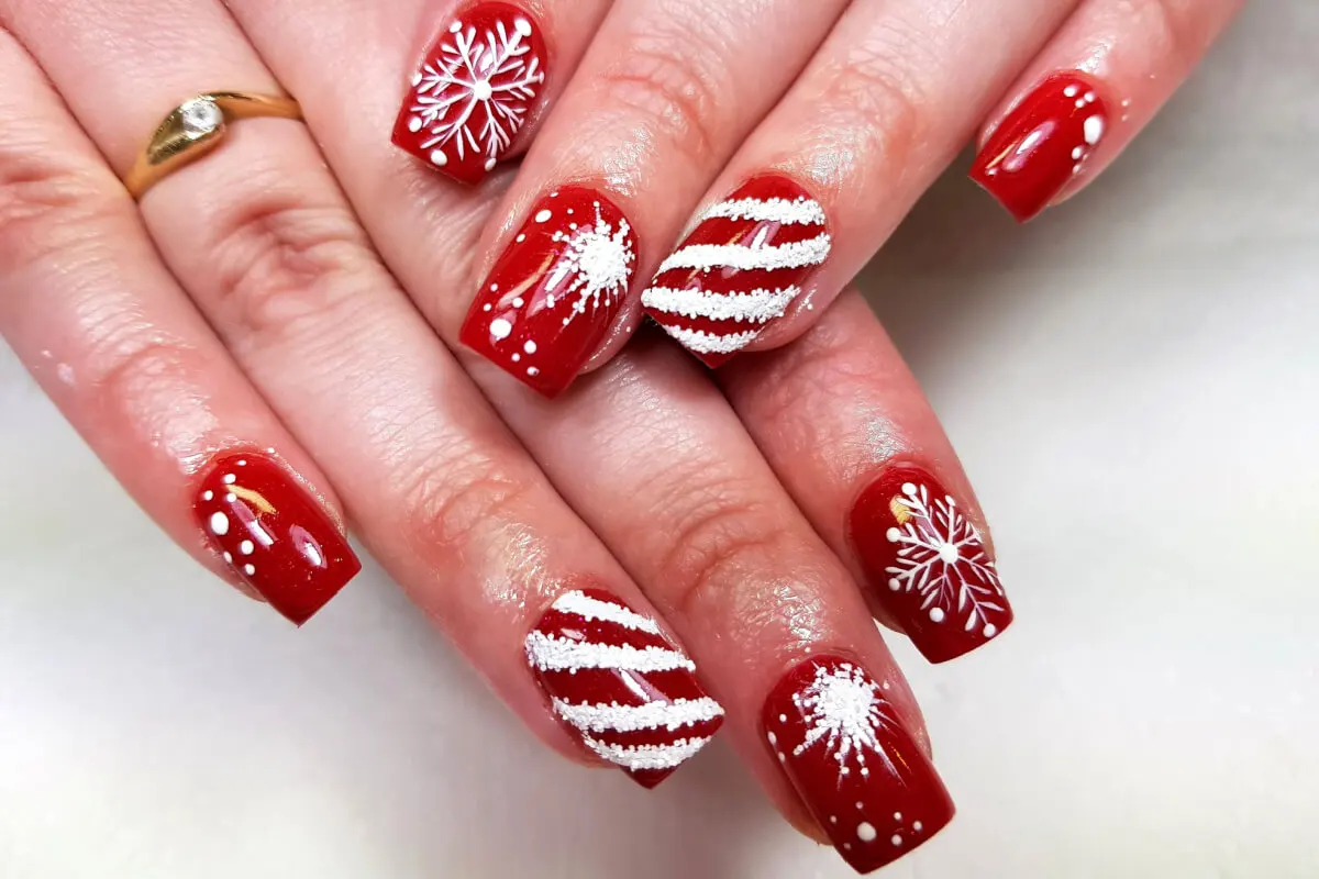 La combinación de rojo y blanco captura la esencia de la Navidad, haciendo que estas uñas sean perfectas para quienes buscan un look festivo y sofisticado. El tono rojo vibrante, evoca la pasión y la calidez de la temporada navideña y los detalles nevados en blanco suman un contraste llamativo.