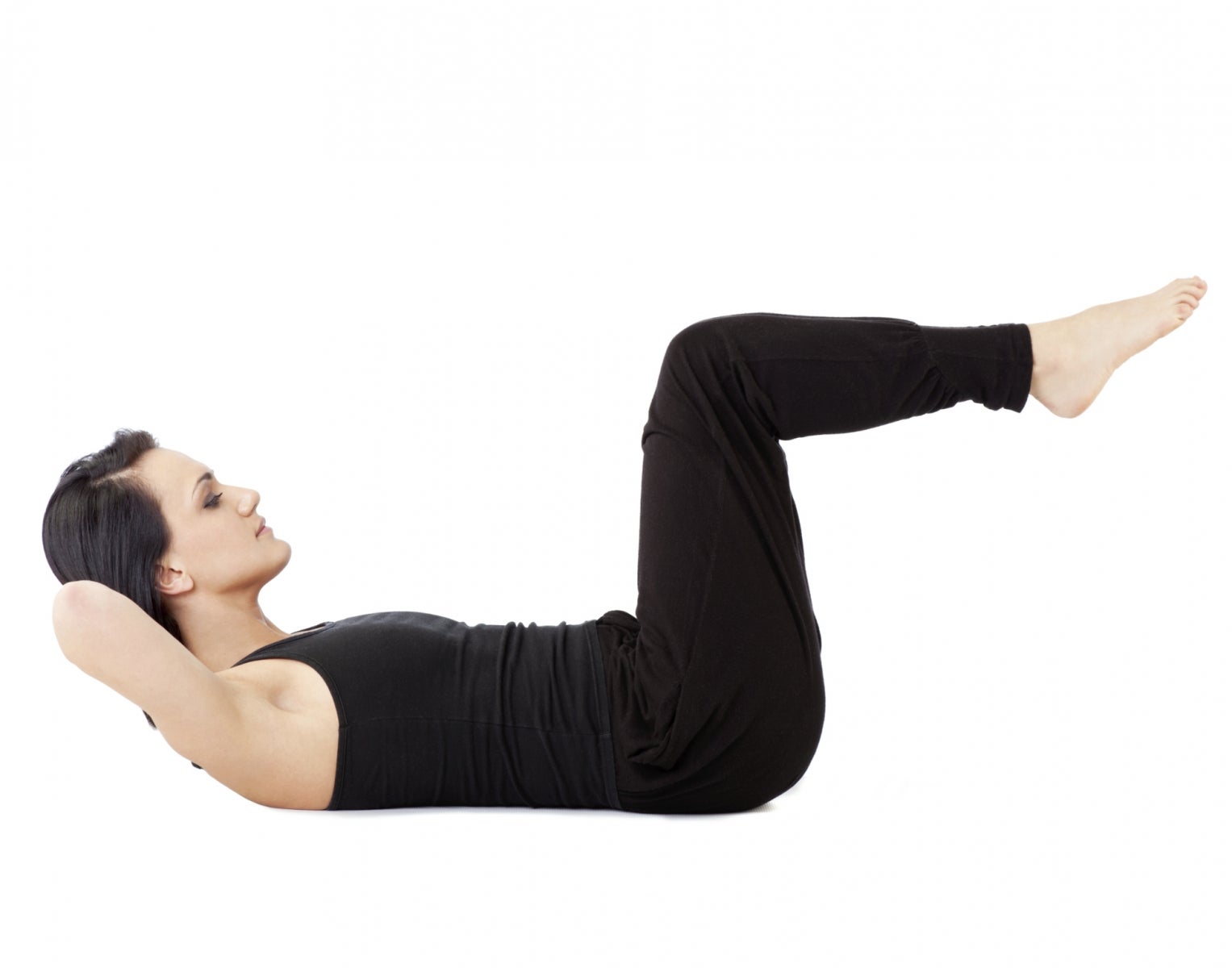 • Primero realiza abdominales “tradicionales”, es decir, acostada boca arriba, semiflexiona las piernas, apoya las plantas de los pies en el suelo. Sube y baja la parte superior del cuerpo, ayudándote con las manos en la nuca. Realiza 4 series de 50 repeticiones.
