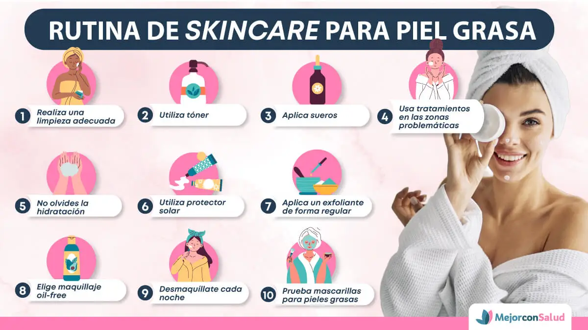 El skincare para piel grasa tiene como principal objetivo remover los residuos de sebo que hacen lucir el cutis brillante, sucio y con los poros obstruidos o dilatados. Este reúne una serie de pasos que abarcan desde la limpieza diaria hasta la hidratación y la adecuada elección de los productos para sus necesidades.