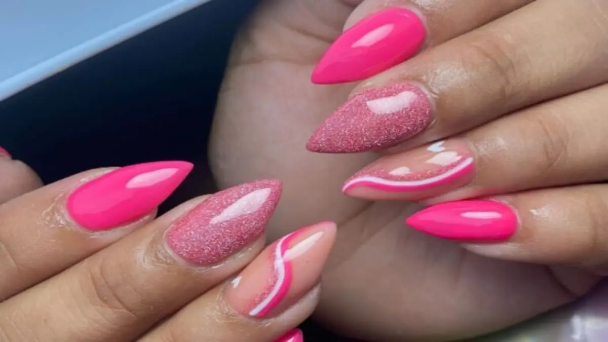Si buscas un diseño para uñas stiletto cortas, debes tomar este en cuenta. Ellas mezclan el color rosa Barbie, con el glitter y las líneas curvas. Lo bueno de llevar las uñas de este tamaño es que son más manejables y perfectas si haces muchas actividades manuales, durante el día.