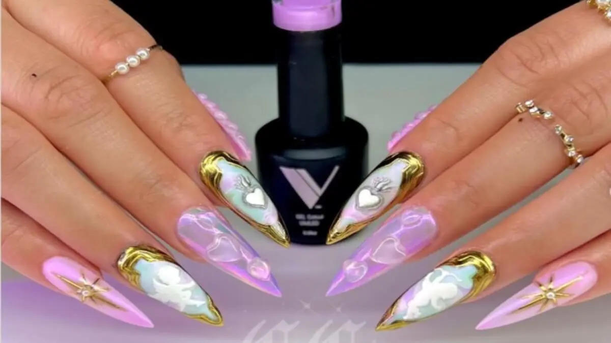 Esta es una idea bastante original y es que no todos los días se ven uñas inspiradas en el Dios del amor. En ellas no se utiliza el típico color rojo que se asocia a Cupido, sino que llevan un color lila, rosa y azul tornasolado, con detalles en dorado. Es una gran opción para el Día de San Valentín.