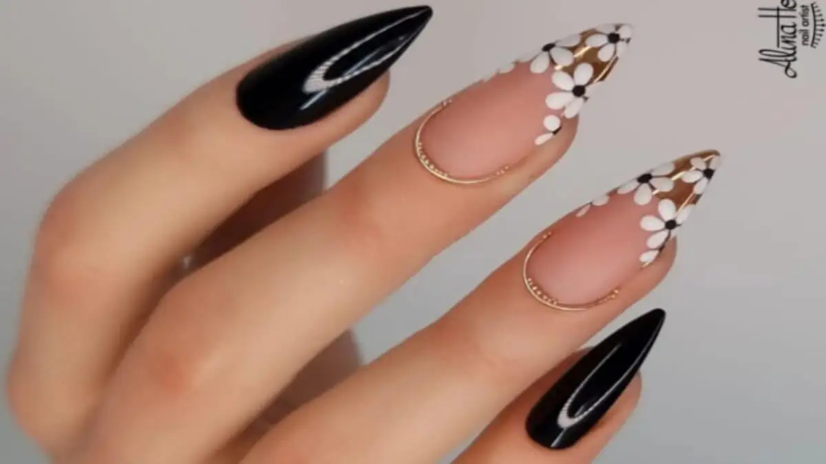 Un diseño minimalista y elegante, perfecto para ir a trabajar. Son uñas bastante sencillas, con gel negro y una francesa de flores blancas en dos de los dedos. El toque de distinción lo da el detalle en color dorado cerca de la cutícula.