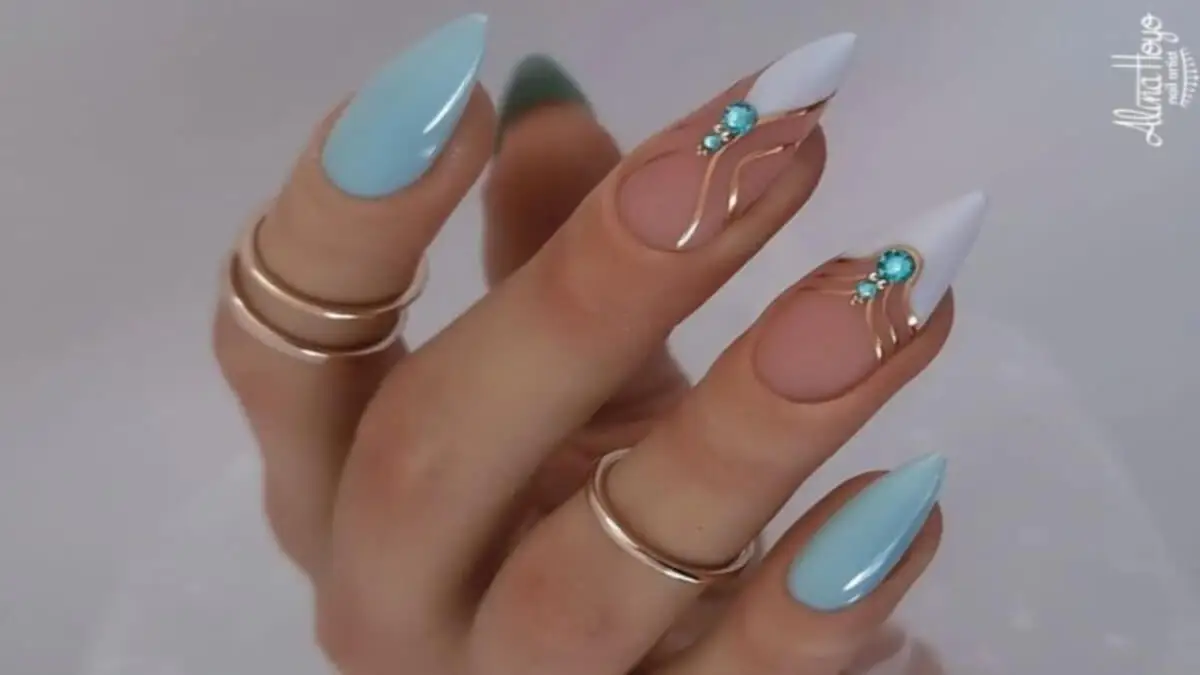 Este modelo guarda cierta relación con el anterior al contar con varias uñas de un solo tono. La diferencia se encuentra en los colores utilizados (azul claro), y las uñas decoradas que llevan pedrería y líneas curvas al estilo swir nails en color dorado, las cuales se ven muy hermosas.
