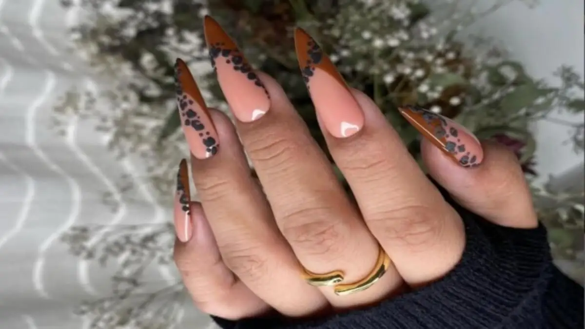 Si buscas un estilo de animal print, pero no quieres el típico de cebra o leopardo, puedes probar las manchas. Cuenta con una línea curva de manchas alrededor de una uña con base de francesa, en color beige y marrón, muy moderna.