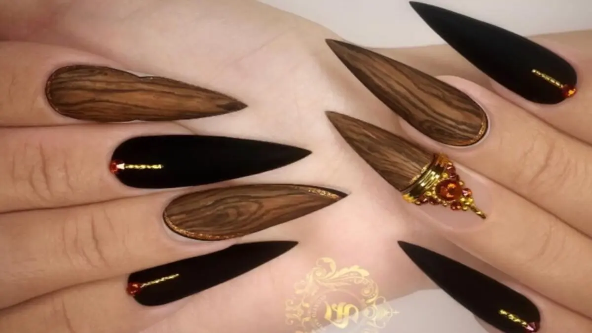 Seguro que al hablar de madera se te viene a la cabeza algún mueble, pero no uñas stiletto, ¿cierto? La verdad es que es un estilo muy innovador que imita a las vetas que tiene la madera natural, y en combinación con la pedrería y el negro mate, da un diseño muy elegante.