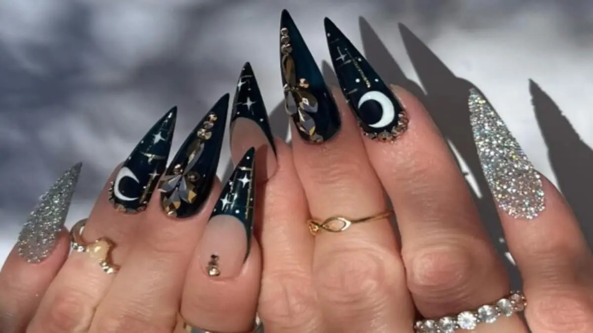 La noche es la inspiración de muchas canciones, pinturas y, como no, de estilos de uñas. Este en particular utiliza bastantes pedrerías en distintos tamaños, así como también dibujos de estrellas y lunas, en un fondo negro de cielo nocturno.