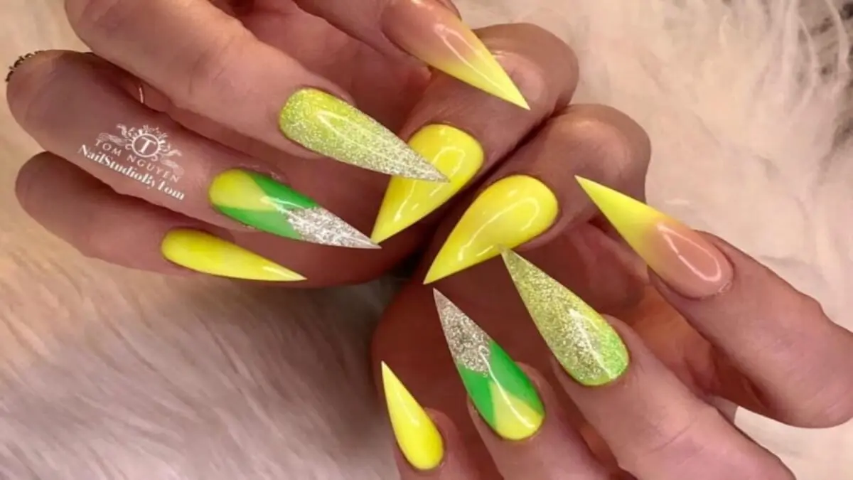 No hay duda de que el glitter es muy versátil y va bien con todos los colores. Aquí lo podemos ver en unas stiletto llamativas de color amarillo, con toques de verde y beis, para un conjunto alegre y colorido.