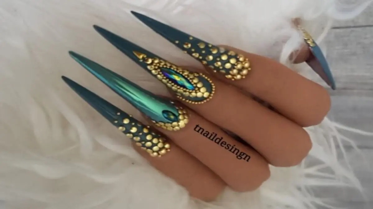 Si vas por unas uñas stiletto muy largas, este es un diseño que se ve hermoso en ellas. Tienen una base verde esmeralda, con detalles de pedrería dorada redonda, de ahí el gold. El «petrol» viene de la uña tornasolada, ya que el petróleo crudo se ve de ese color con la acción del sol.