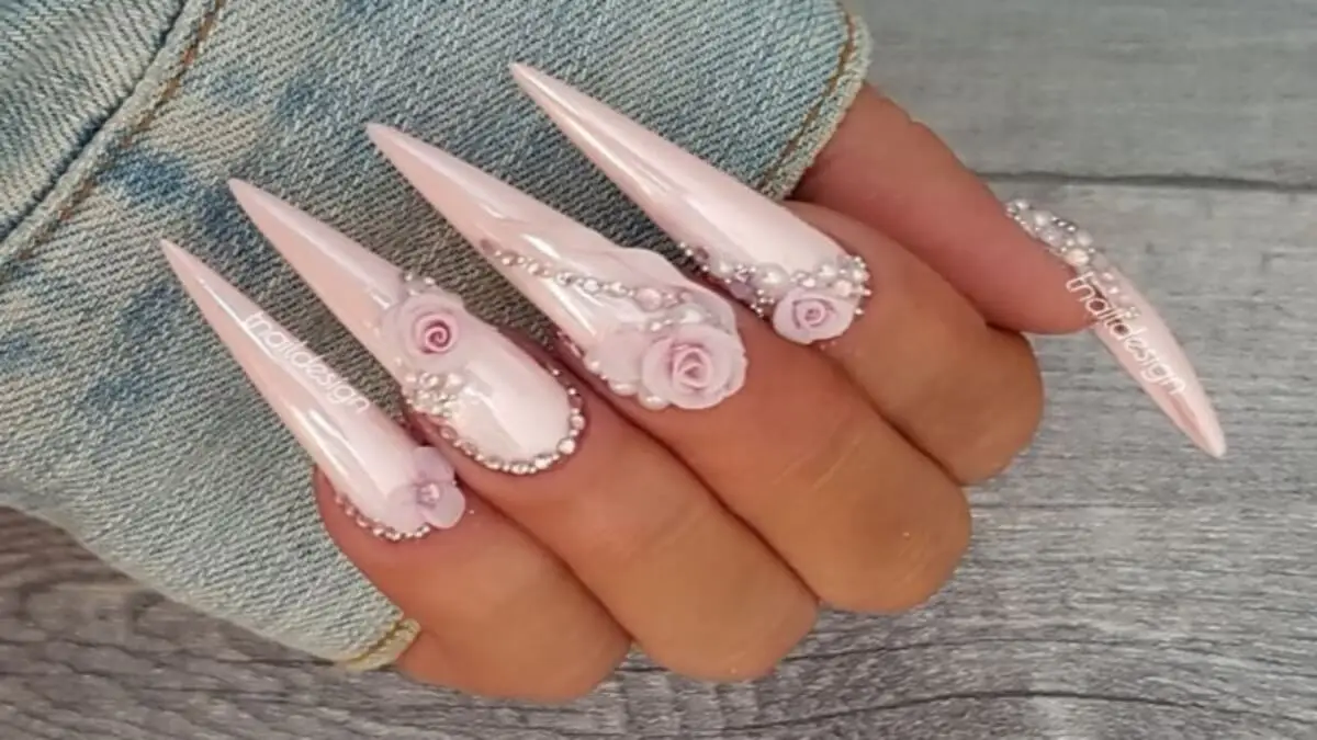 La palabra que mejor describe a este diseño de uñas es femeninas. Son de un color rosa pálido, con decoraciones 3D de rosas del mismo tono, así como también detalles en perlas y pedrería. Son el estilo perfecto si buscas algo delicado y romántico.
