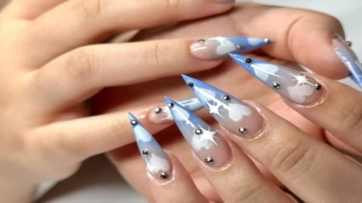 ¿Te gustan las uñas ombré? Entonces debes probar este diseño, que es un punto medio entre rudo y delicado. Por un lado, tenemos al degradado en azul y beis con dibujos de corazones y estrellas. Mientras que por el otro está la pedrería pequeña muy al estilo dot nails, que combinada con la forma stiletto, dan un toque sofisticado a las uñas.