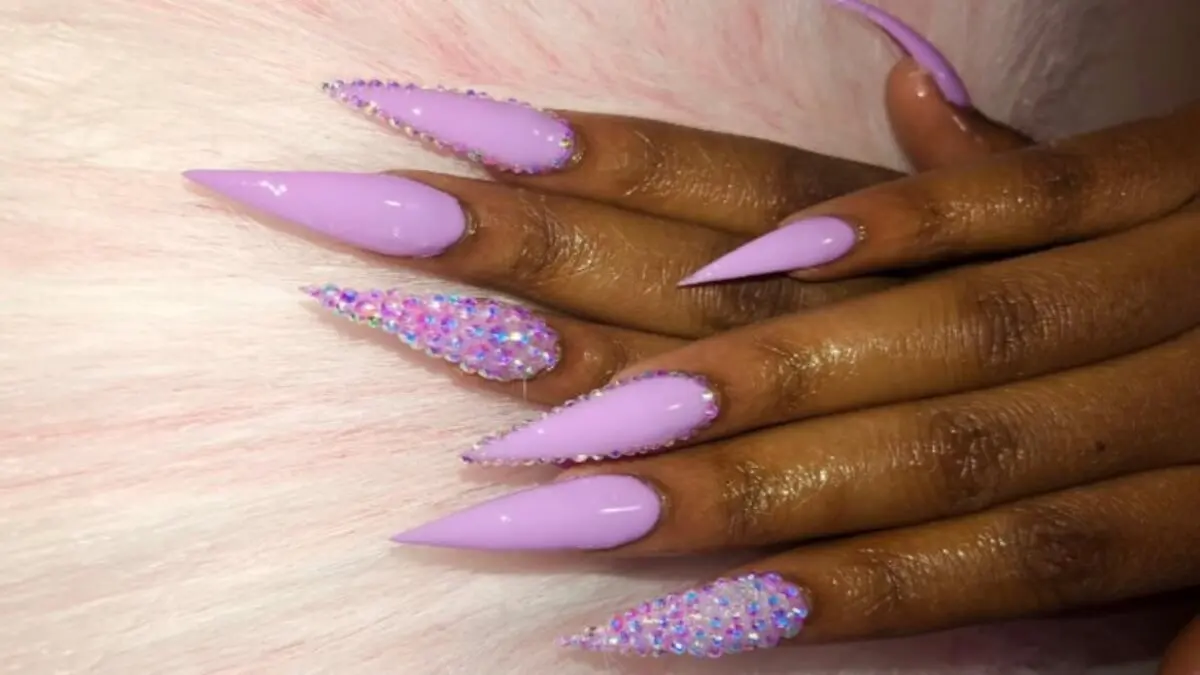 Las uñas Atlanta son unos de los diseños que realzan la pieles morenas. Este modelo, cuenta con pedrería por completo en una de las uñas y cristales en todo el borde de otra. Su base es de un color lila que la hace lucir muy minimalista, para hacer contraste con todo el brillo.