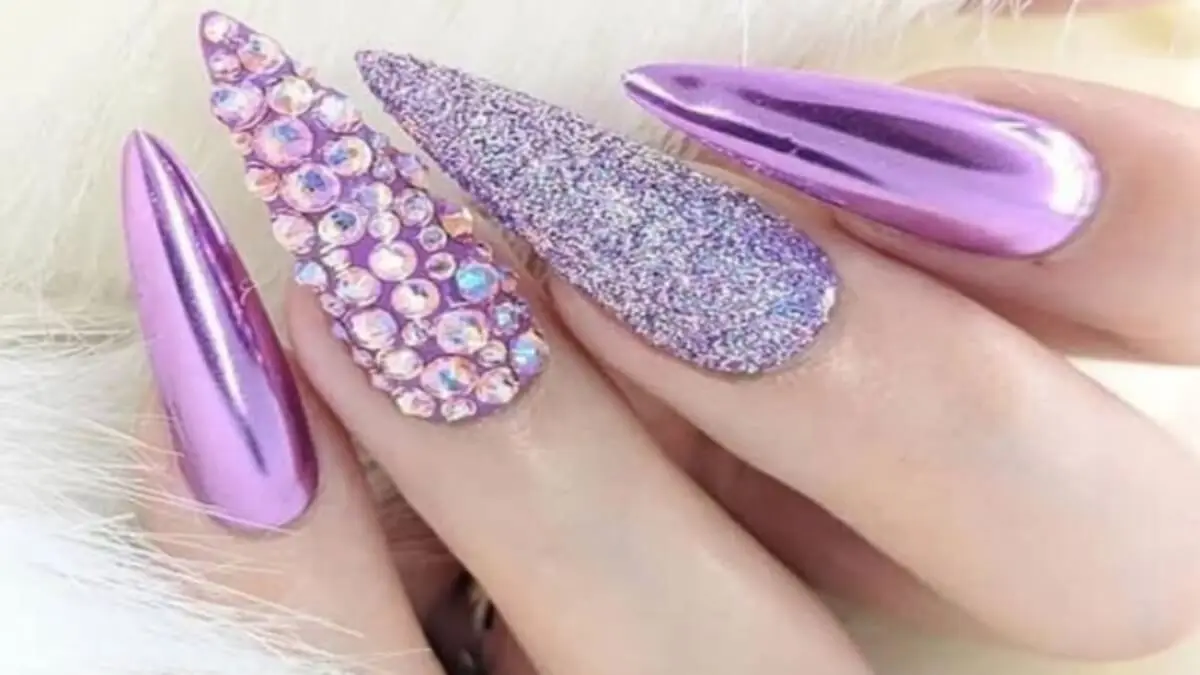 Las uñas candy son perfectas si quieres un estilo coqueto y llamativo. Mezclan el glitter, con los cristales y uñas con efecto metalizado en color lila. Son perfectas para usar en la noche, ya que brillaran por la pedrería y los acabados metálicos reflejarán la luz.