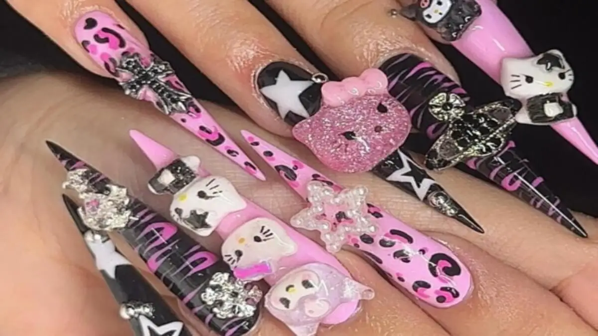 Si las caricaturas son lo tuyo, entonces debes atreverte a lucir las uñas Hello Kitty. Ellas tienen una base de animal print y sobre ellas decoraciones adheridas de Kitty y Kuromi (otra de sus amigas). Además, tiene más adornos, como estrellas y pedrería 3D.