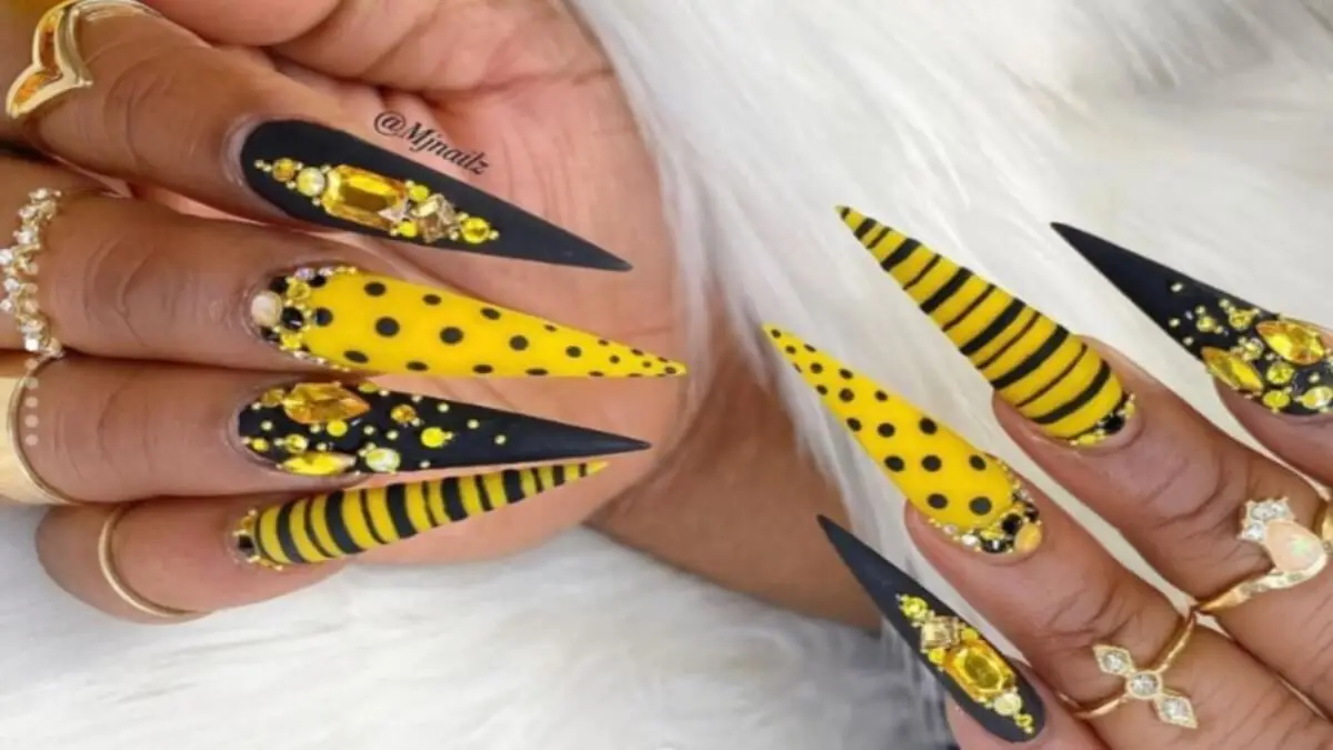 Como puedes ver, estas uñas se inspiran en los colores de las abejas (amarillo y negro), pero combinando distintos diseños y decoraciones. La cereza del pastel es la pedrería, que aporta ese toque de elegancia.