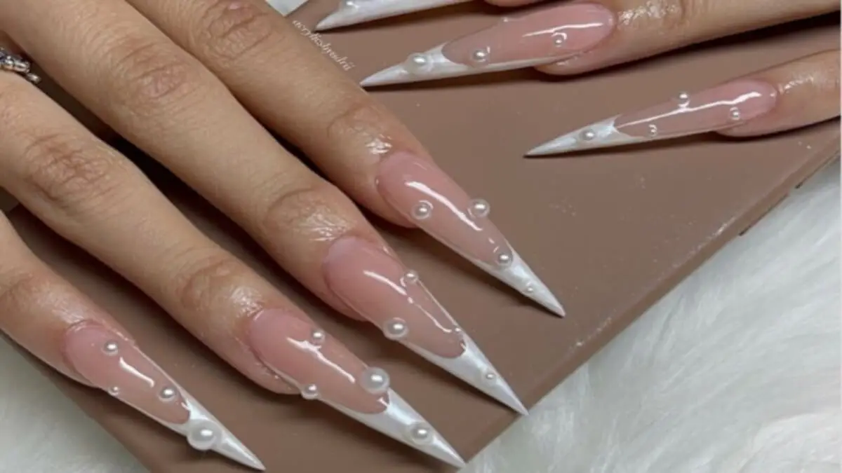 La palabra que describe mejor a esta idea de manicura para uñas largas es elegante. Las perlas se asocian a la distinción y refinamiento, combinadas con una francesa clásica como base, dan un estilo que mezcla lo conservador y lo moderno, esto último representado en la forma de punta.