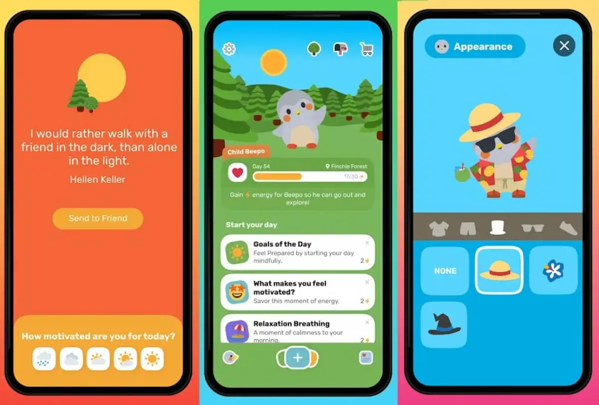 De nuevo, basándose en la gamificación y la estética como elementos motivadores, Finch es una aplicación centrada en los autocuidados. En ella, atendemos a un pequeño pingüino que te devuelve positividad y mensajes de apoyo. Tiene un sistema de tareas a las que se les puede regular la dificultad y un sistema de premios basado en la compra de elementos de decoración y moda para Finch y su casa.