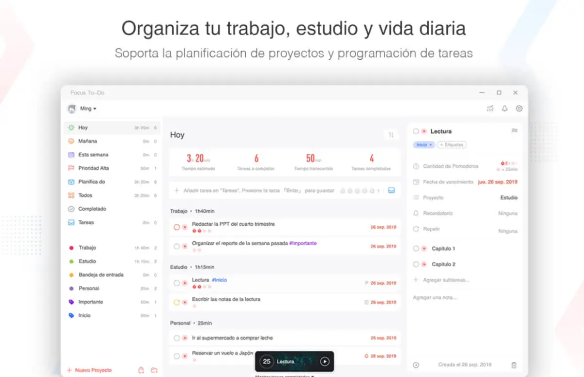 El timing es muy importante en la adquisición de hábitos, pues al principio tendrás que dedicarle más horas y esfuerzo. Para ello, muchas personas recurren a la técnica Pomodoro, que consiste en hacer pequeñas pausas cada 25 minutos de productividad. Focus To Do es una app muy completa que se basa en esto para ayudarte a adquirir hábitos que requieran dedicación, como hacer ejercicio o estudiar.