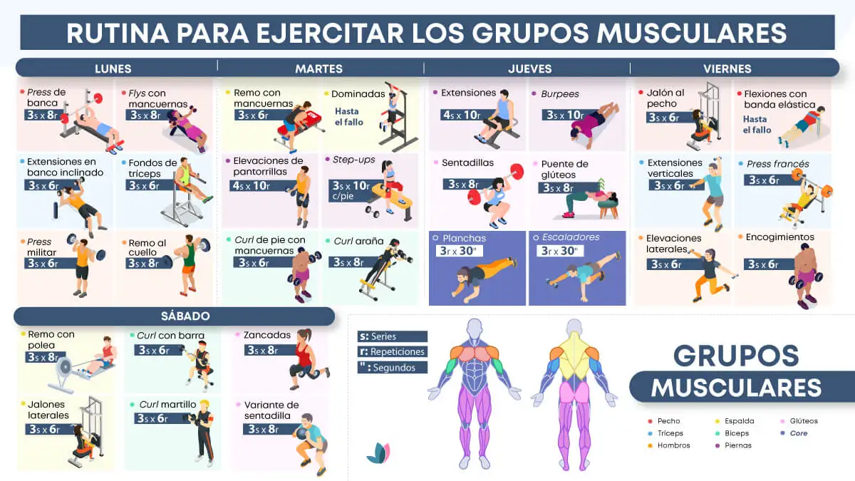 Si tomas los ejemplos anteriores, puedes diagramar un programa de entrenamiento basado en cuatro ejercicios por grupo muscular y cinco jornadas de actividad a la semana. Así las cosas, una rutina ideal quedaría de la siguiente manera: