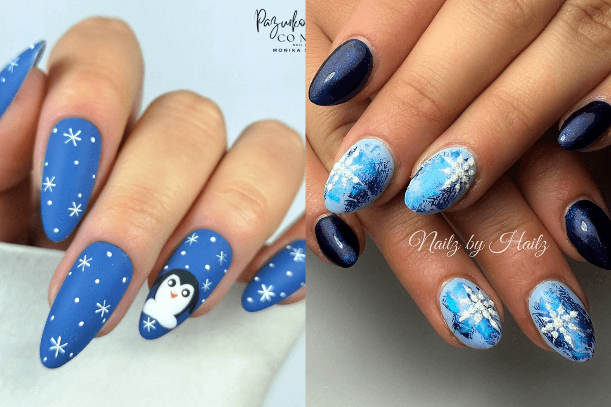 - Copos de nieve blancos: para realizar este diseño te recomendamos usar un pincel fino, ya que así tendrás mayor precisión. Puedes dibujar los copos tradicionales o intercalar con otros motivos como muñecos de nieve. De igual manera, si eres fanática del brillo, puedes añadir pedrería de fantasía para hacer más llamativa tu manicura.