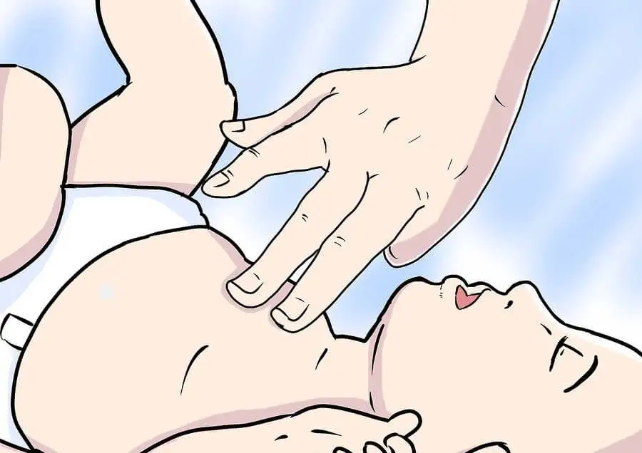 - Coloca al bebé cuidadosamente boca arriba en una superficie dura. Con una mano sostén la frente del bebé, inclinando la cabeza hacia atrás. Con la otra mano, aplica una presión en el pecho del bebé, que baje de 3 a 4 centímetros, y luego deja que el pecho se levante por completo.