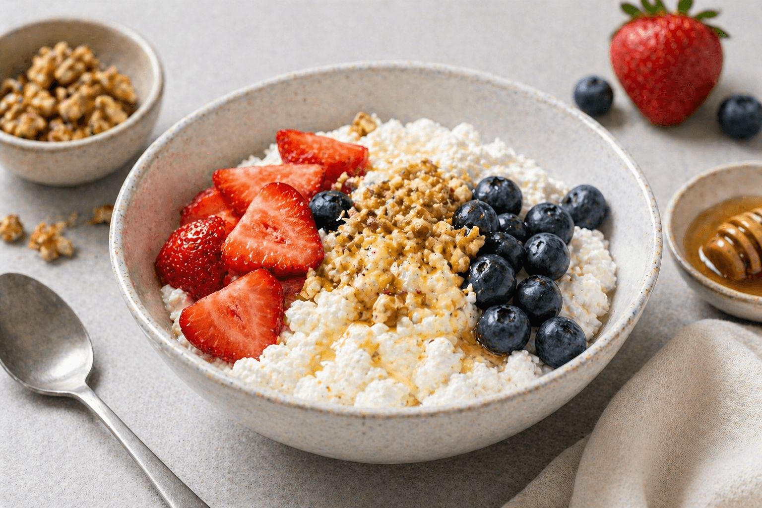 El queso cottage es rico en proteína y tiene una textura ligera que suele entrar bien incluso cuando no tienes demasiada hambre. Al añadir fruta, completas el snack con carbohidratos y un toque dulce.