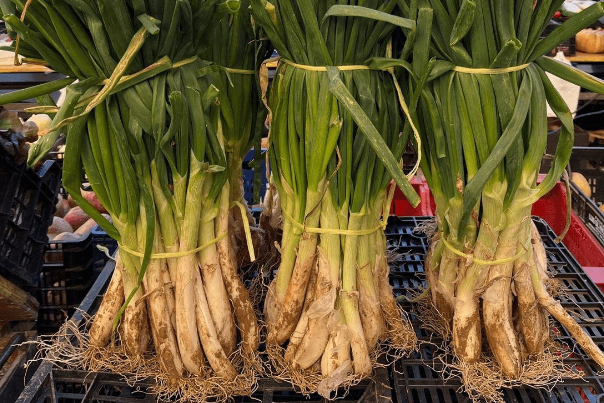 El calçot, una variante de cebolla blanca inmadura con similitudes al cebollín. Posee un tallo grande y grueso de color blanco, con hojas verdes en la parte superior; y es prominente en la gastronomía catalana. Debe su nombre al término catalán “calçar“, relacionado con el método de cubrir la cebolla con tierra, durante su crecimiento, para estimular su alargamiento hacia la luz.