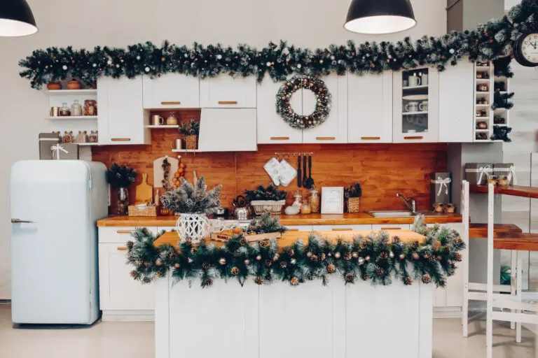 La cocina es un espacio donde la funcionalidad y la estética se encuentran. Aprovecha el espacio de la encimera colocando pequeñas macetas con hierbas aromáticas de temporada, además de guirnaldas de abetos y piñones.