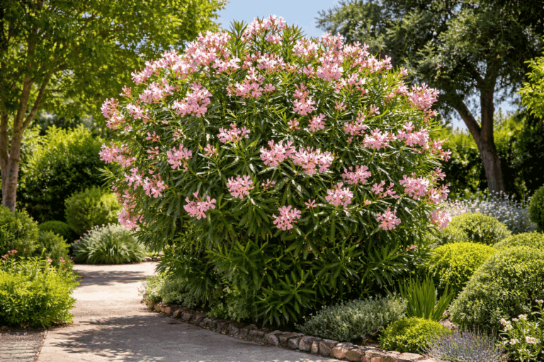 Es uno de los arbustos más versátiles para ganar altura en exterior. Puede superar los tres metros con facilidad, tiene un follaje perenne y denso, y florece con generosidad entre primavera y otoño.