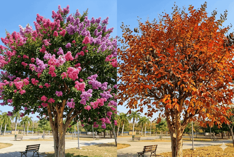 Durante el verano se cubre de flores vistosas en tonos rosados, morados o blancos, y en otoño el follaje vira a tonos cálidos antes de caer. En invierno queda sin hojas, pero la corteza jaspeada del tronco mantiene un interés visual propio. Rara vez supera los cuatro o cinco metros, lo que lo convierte en un pequeño árbol ornamental perfecto para jardines de tamaño medio.